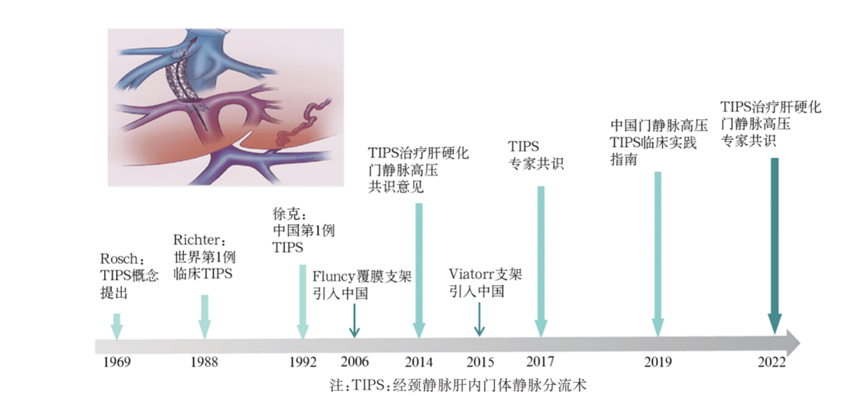 TIPS臨床效果迅速且明顯,獨特優(yōu)勢主要有3點:①創(chuàng)傷輕微、直接有效、針對性強、康復快、副反應?。虎趯﹄y以控制和反復發(fā)作的食管-胃底靜脈曲張破裂出血效果突出;③對門脈高壓性胃病和頑固性腹水的治療效果突出。經(jīng)頸靜脈肝內(nèi)穿刺器械是該微創(chuàng)手術中使用的主要器械,過去主要依賴美國進口,嚴重影響我國TIPS手術的發(fā)展以及患者的治療需求。經(jīng)頸靜脈肝內(nèi)門體靜脈分流術(TIPS)是通過介入途徑在肝靜脈與門靜脈之間建立肝內(nèi)分流道(圖1),旨在降低門靜脈壓力。從TIPS成功治療第1例門靜脈高壓靜脈曲張出血患者開始,經(jīng)過30余年的臨床探索和改進(圖1),該技術目前已廣泛應用于藥物治療無效的門靜脈高壓及其并發(fā)癥。